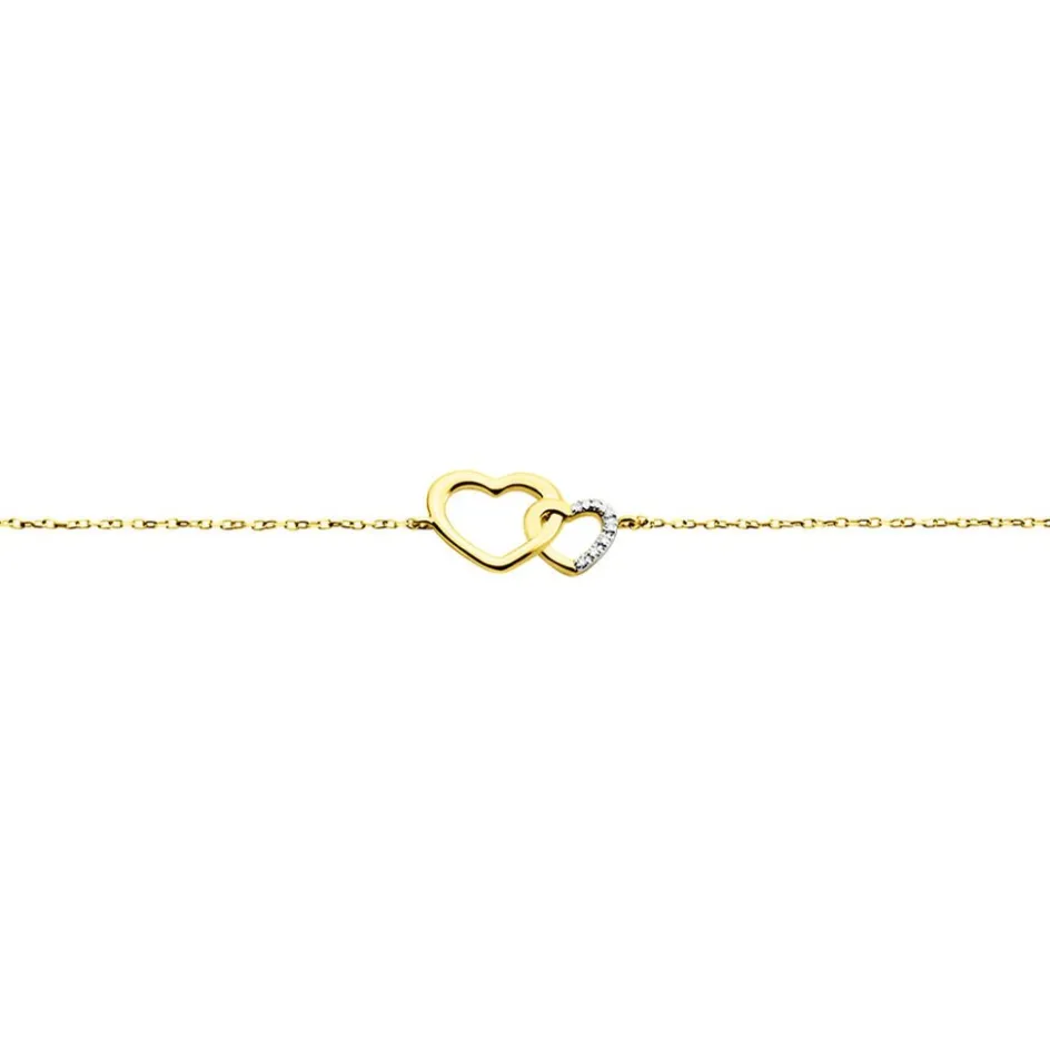 Bracelet Or Jaune 375/1000 Forme Double C艙ur Pavage Diamants Blancs Maille Forçat 16+2cm