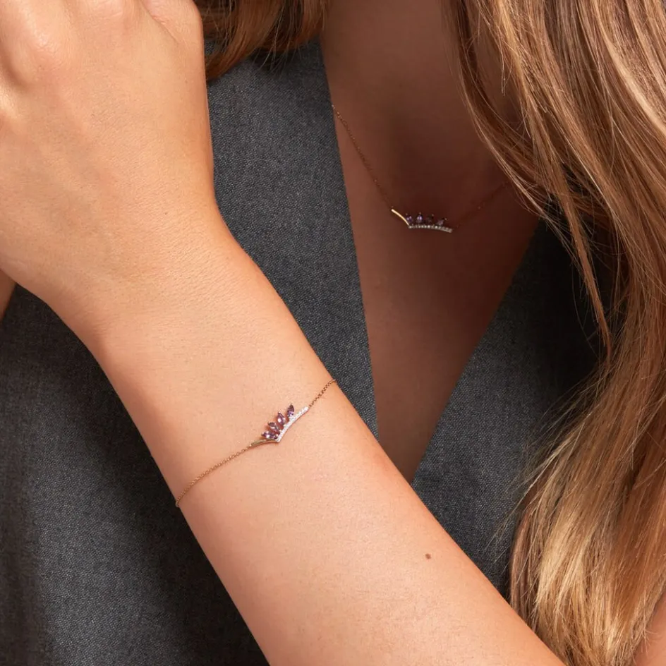 Bracelet Or Jaune 375/1000 Petales Amethyste Navette 0.30cts Serti Griffes Et Pavage Oxyde Maille Forcat 16+2cm