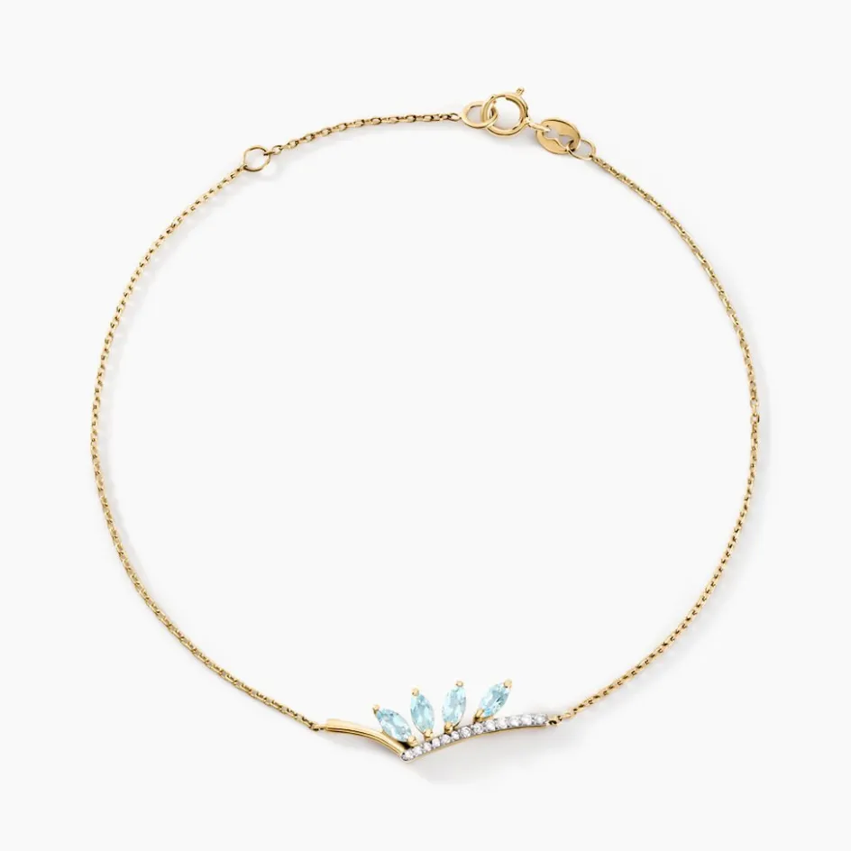 Bracelet Or Jaune 375/1000 Petales Topaze Bleu Sky Navette 0.36cts Pavage Oxyde Maille Forcat 16+2cm