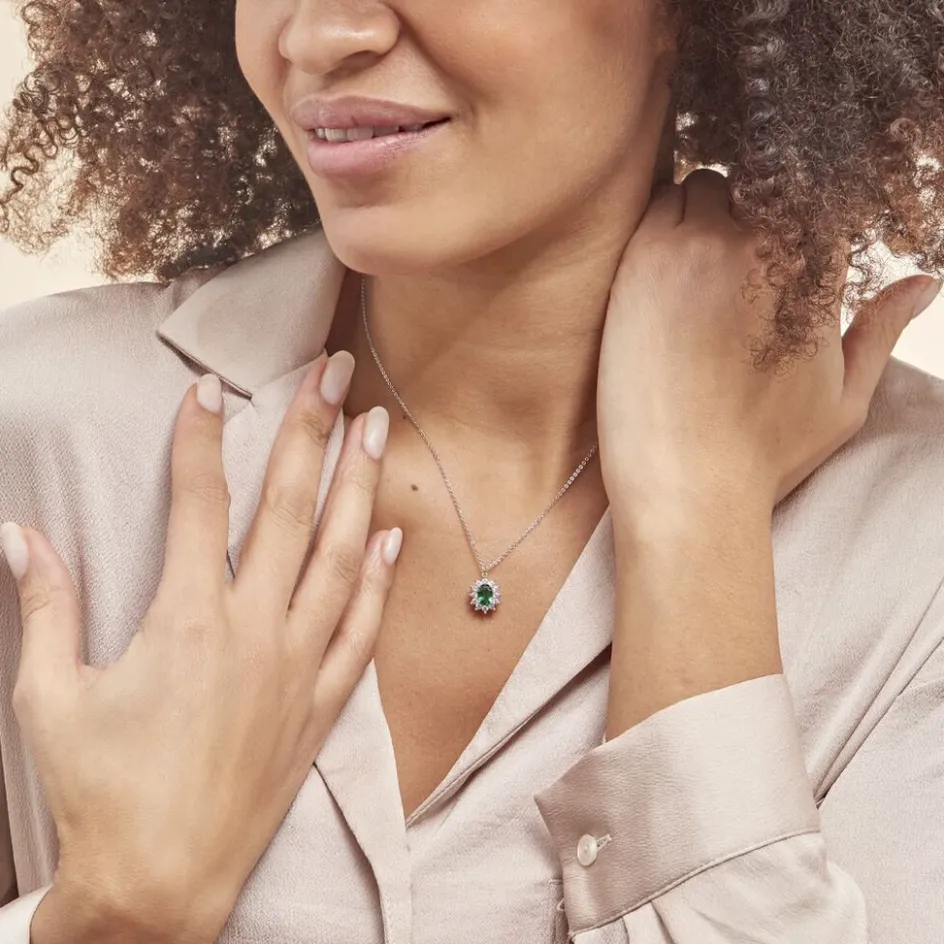 Collier Solitaire Argent 925/1000 perez Forme Marguerite Verte Serti Griffes Entourage Oxydes Maille Forcat 45cm