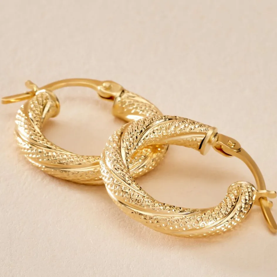 Creoles Or Jaune 375/1000 Fil Rond Torsadé Effet Piqueté Diamètre 10mm