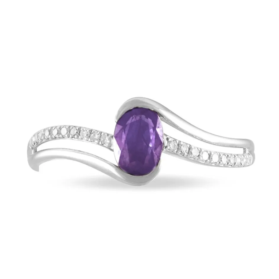 Bague Or Blanc 375/1000 Amethyste Violette Claire Centrale Et Vague Diamants