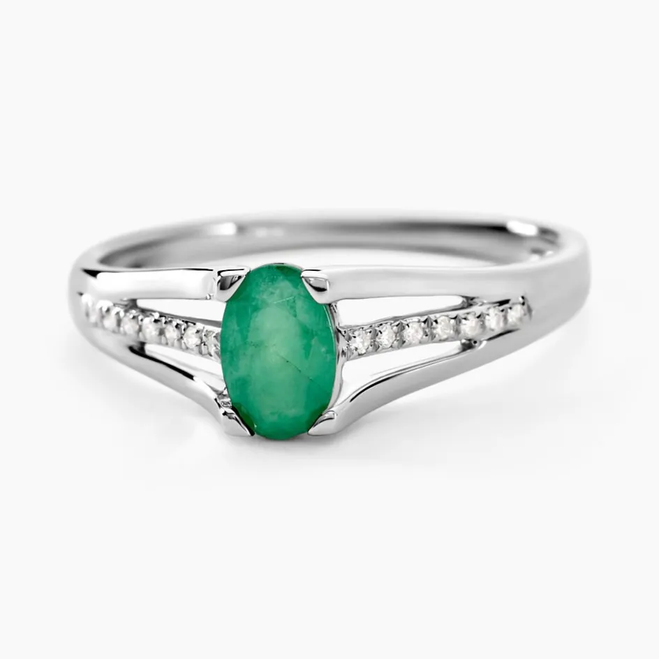 Bague Or Blanc 375/1000 Emeraude Centrale Corps De Bague Accompagne Diamants