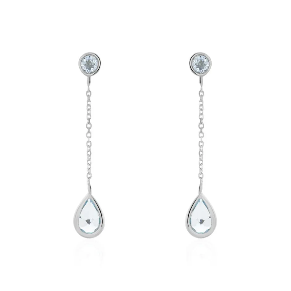 Boucles D’oreilles Or Blanc 375/1000 Pendantes Topazes Bleues Sur Chaine Maille Forçat