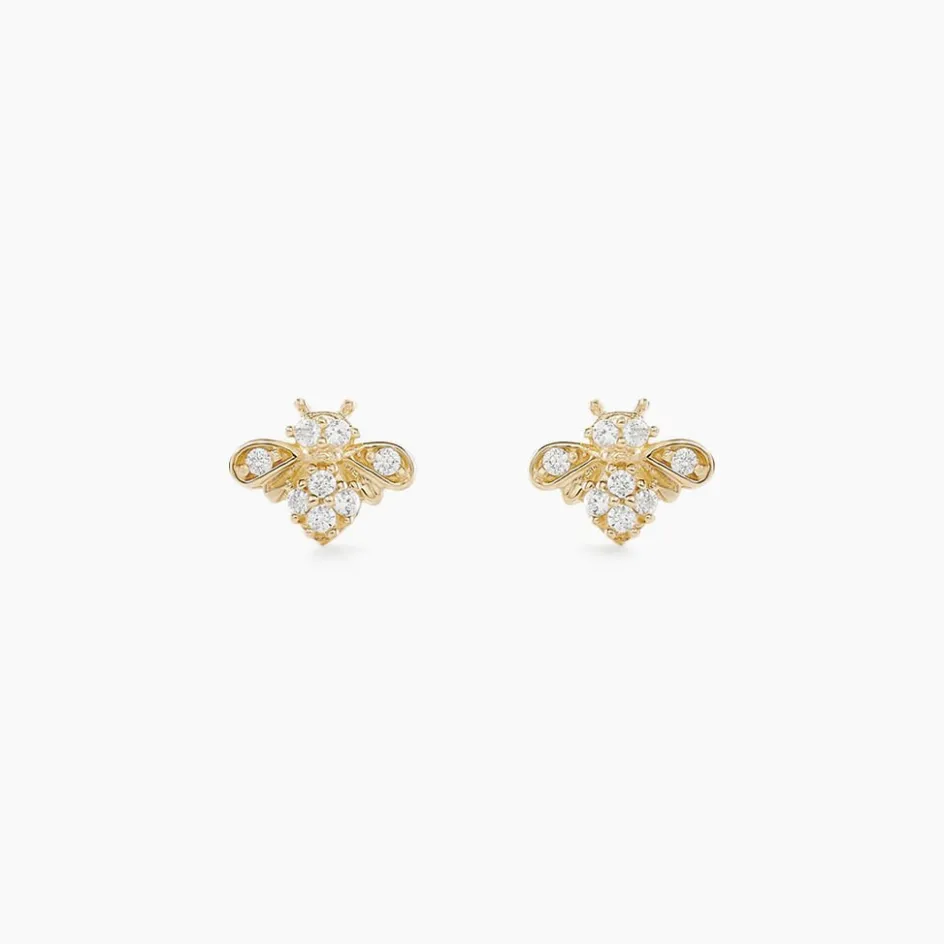 Boucles D’oreilles Puces Or Jaune 375/1000 Abeilles Pavage Oxydes De Zirconium