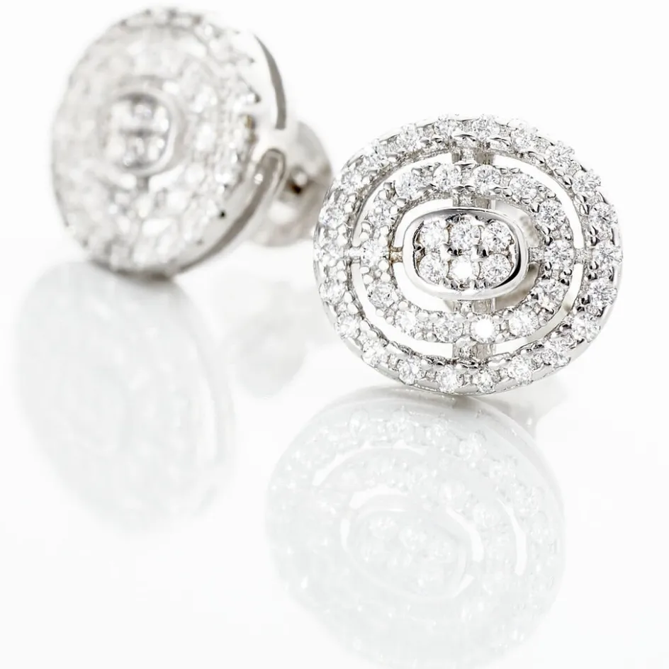 Boucles D’oreilles Puces Argent Blanc 925/1000 Entourages Ajoures Formes Ovales Pavage Oxydes De Zirconium