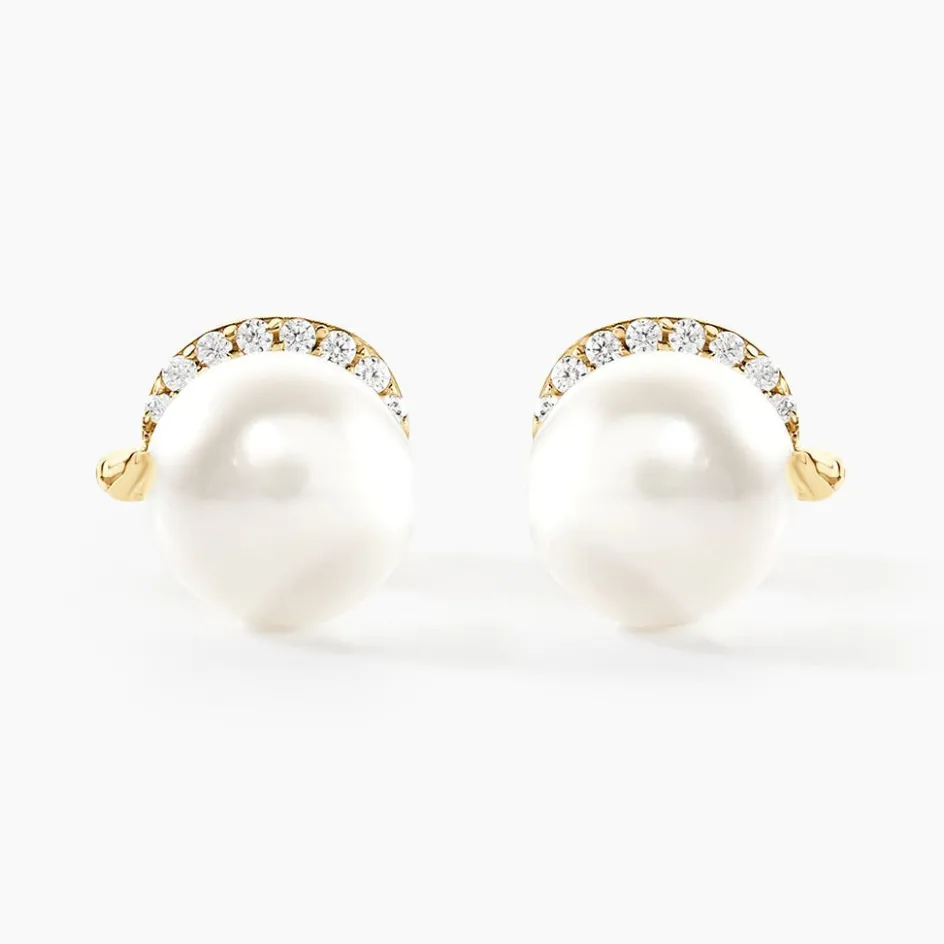 Boucles D’oreilles Or Jaune 375/1000 Puces Perles De Culture 7mm Spirale Oxydes De Zirconium