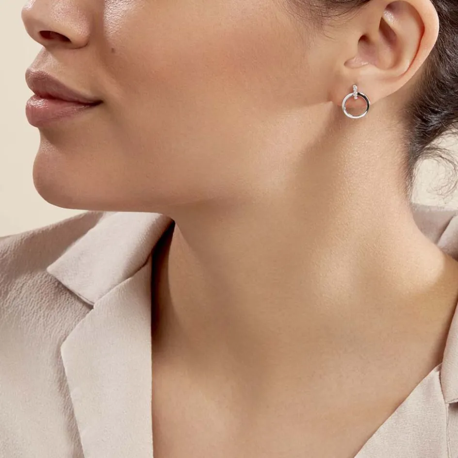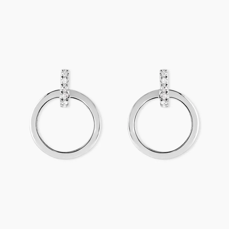 Boucles D’oreilles Or Blanc 375/1000 Forme Cercle Et Barrette Pavage Diamants