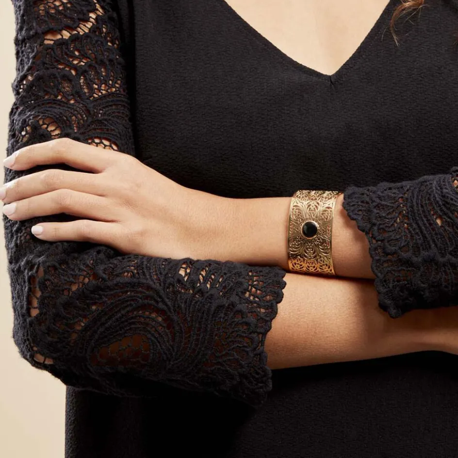Bracelet Jonc Acier Dore Arabesques Agate Noire Diametre 60mm