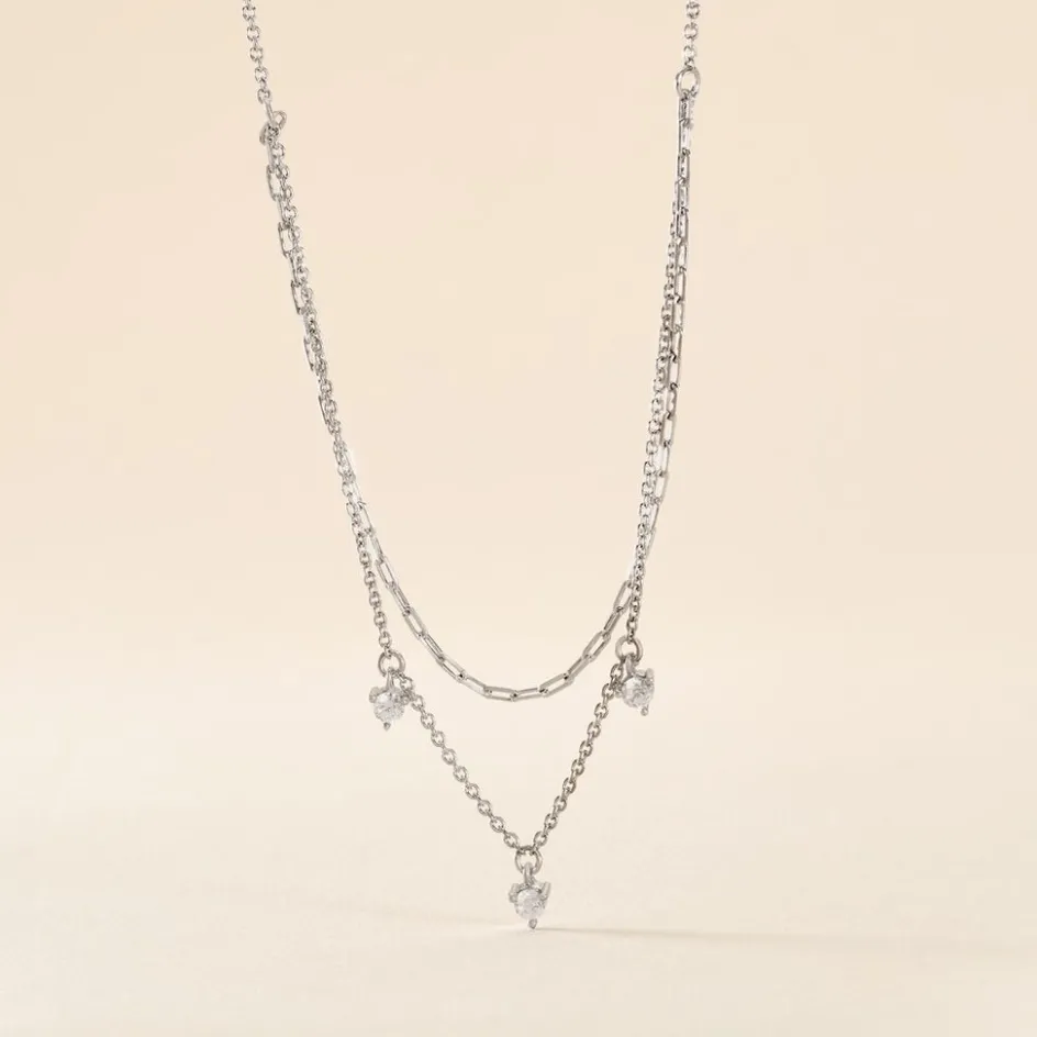 Collier Argent 925/1000 laetita Double Chaine Pampilles Oxydes De Zirconium Maille Forcat 39cm