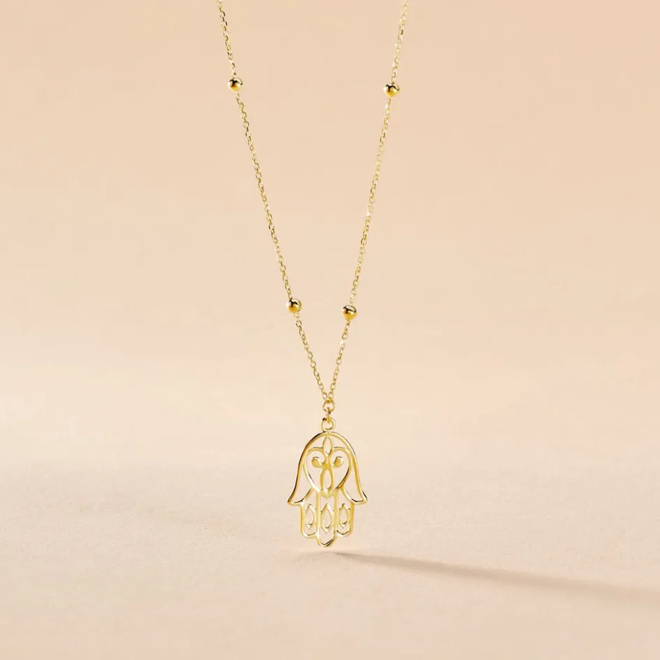 Collier Or Jaune 375/1000 Motif Main De Fatma Ajoure + Petites Boules Sur Chaine Maille Jaseron 42cm