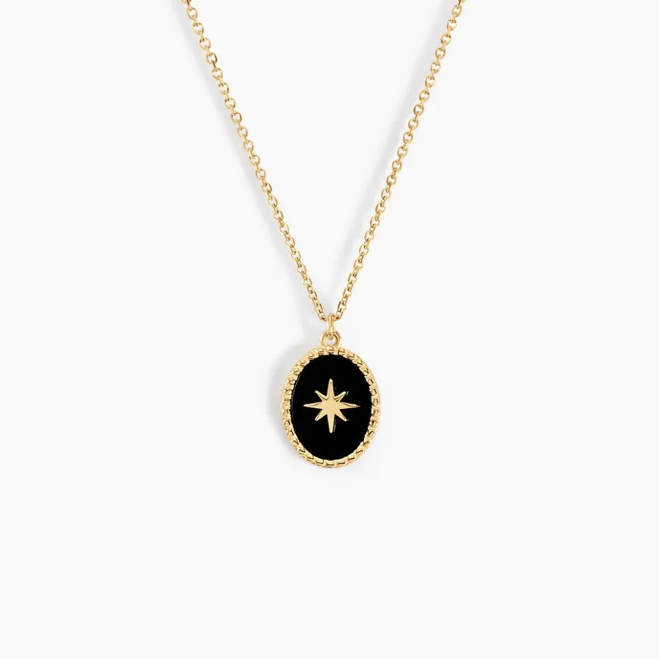 Collier Or Jaune 375/1000 Medaille Ovale Effet Perle Email Noir Mat Motif Etoile Maille Jaseron 40+2cm