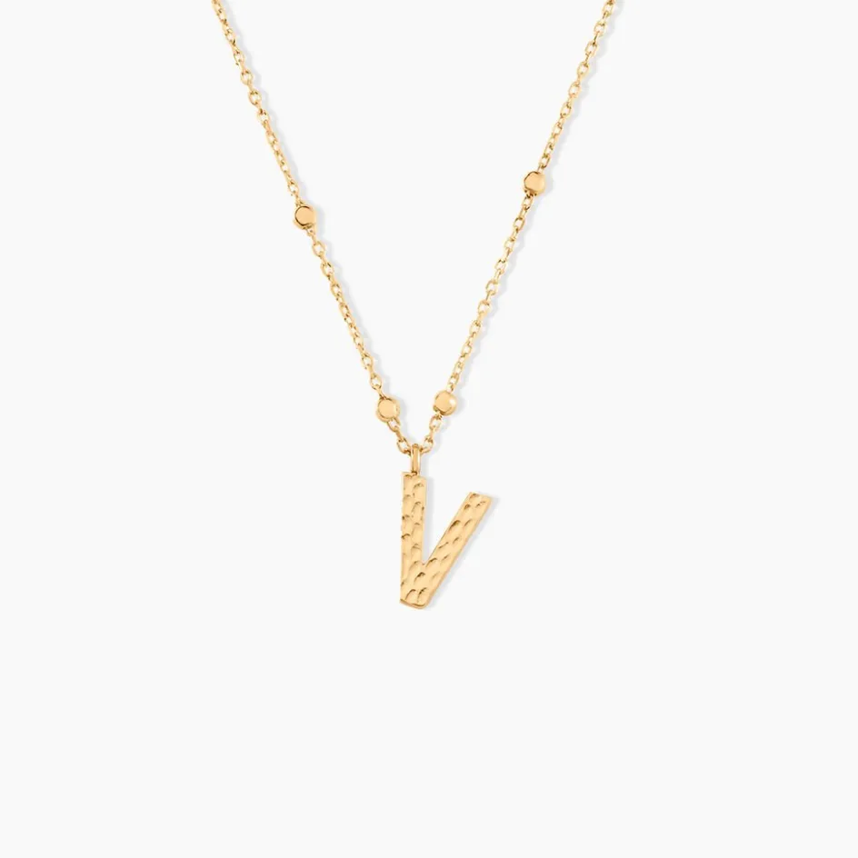 Collier Plaque Or Jaune Lettre V Martelee Et Petites Boules Chaine Maille Forcat Longueur 45cm