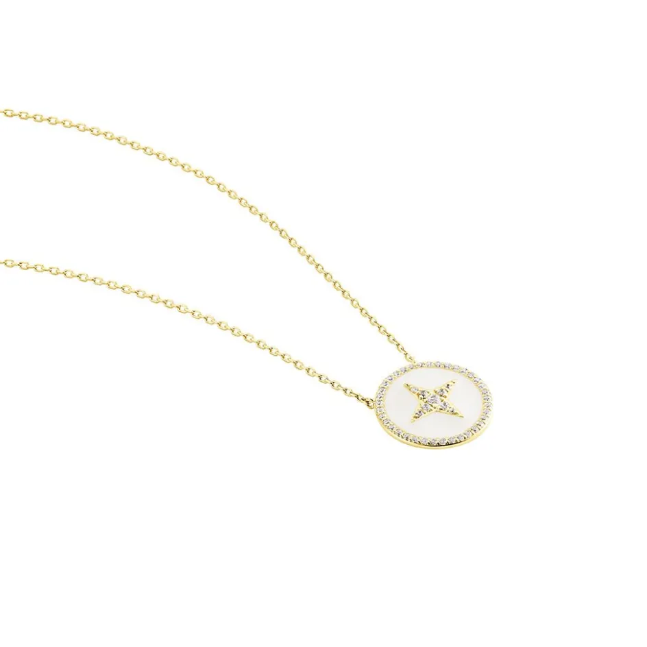Collier Or Jaune 375/1000 Email Blanc Etoile Oxyde De Zirconium Blanc Serti Pavage Maille Forçat 40+2cm