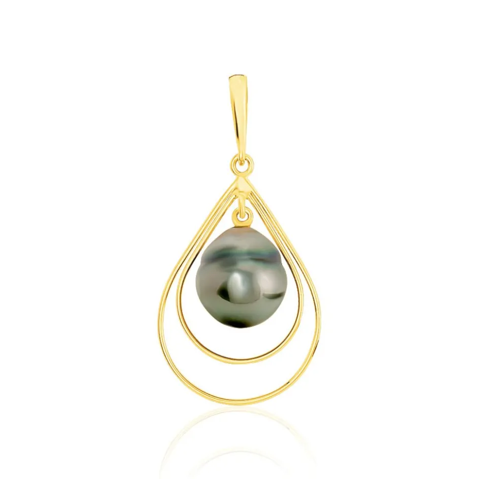 Pendentif Or Jaune 375/1000 Semi-baroque Ajoure Perle De Culture De Tahiti Noire 8.5/9mm
