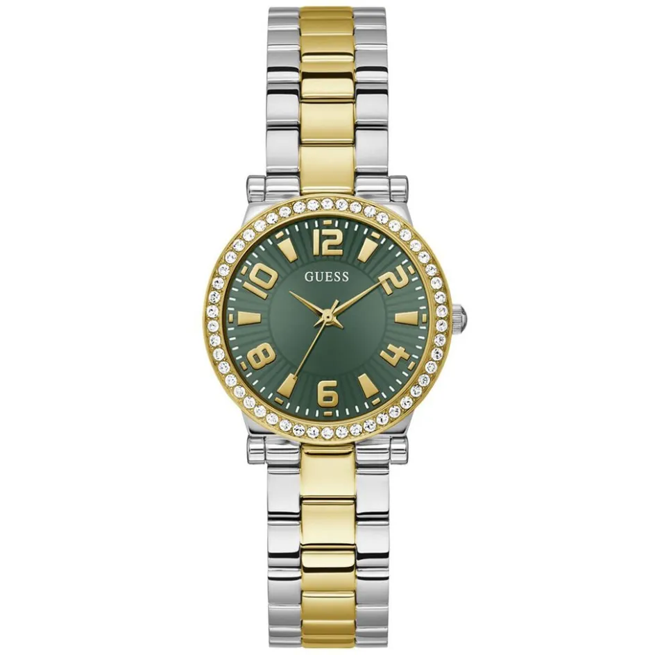 Montre Guess Fawn Acier Bicolore Doré Blanc Ronde Quartz 32mm Lunette Strassée Fond Vert Bracelet Acier Argenté Gw0686l2