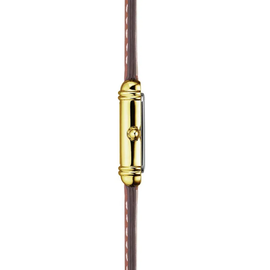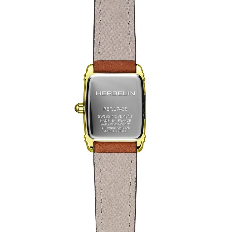 Montre Herbelin Art Deco Acier Inoxydable Doré Quartz Rectangulaire 17,8X19,4Mm Fond Argenté Bracelet Cuir De Veau Marron 17438P1N22Gd