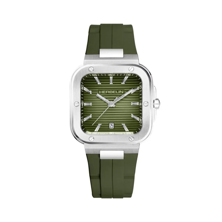 Montre Herbelin Cap Camarat Acier Inoxydable Argenté Quartz Carre 39Mm Fond Kaki Bracelet Silicone Kaki 12246A116Ck