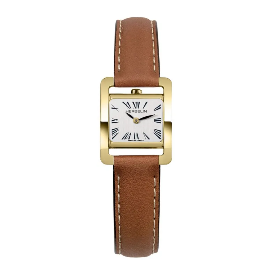 Montre Herbelin V Avenue Acier Dore Rectangulaire Quartz 22.5mmx17mm Fond Blanc Bracelet Cuir De Veau Marron 3atm 17037p01gd