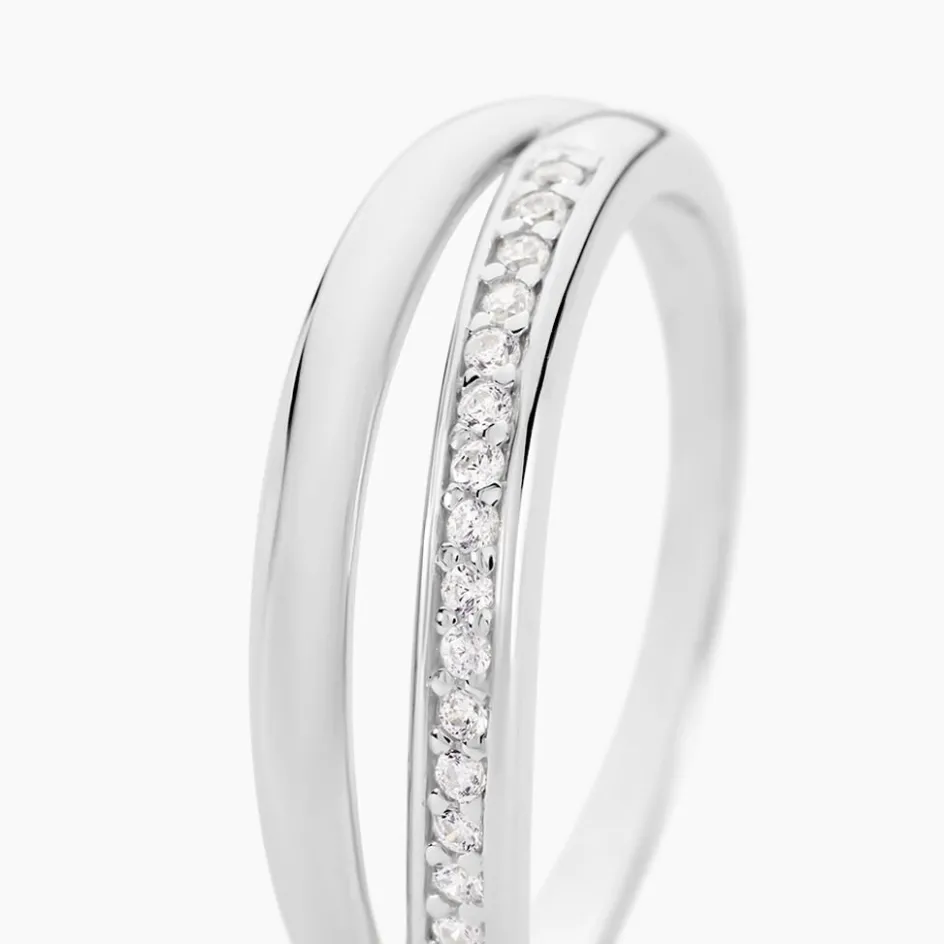 Bague Argent Blanc 925/1000 Double Vagues Ajourés Un Côté Oxydes De Zirconium Micro Serti