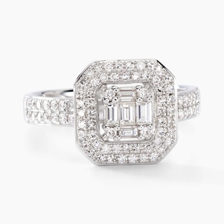 Bague Or Blanc 375/1000 Multipierres Entourage Octogonal Diamants Rectangles 0.12cts Sertis Griffes Et Accompagne