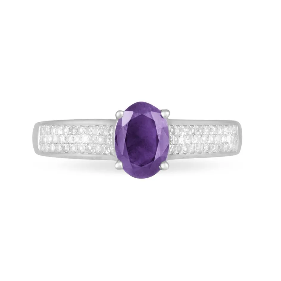 Bague Or Blanc 375/1000 Amethyste Violette Claire Ovale Accompagnee Diamants Mm