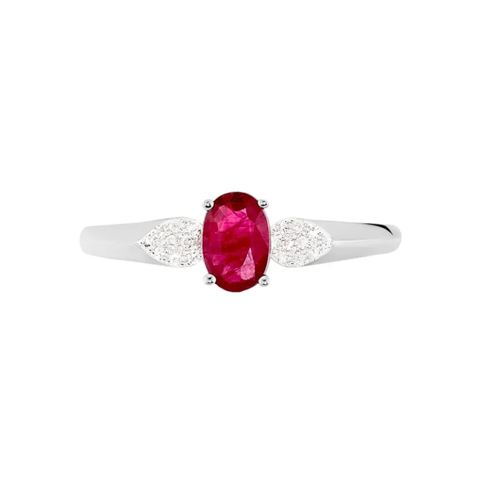 Bague Or Blanc 375/1000 Rubis Central Forme Ovale + Pavage Diamants