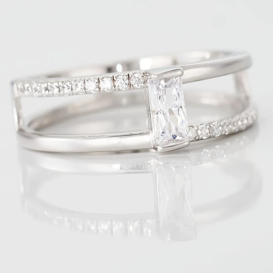Bague Argent Blanc 925/1000 2 Rangs Ajoures Oxyde De Zirconium Central Taille Emeraude Et Semi Pavage