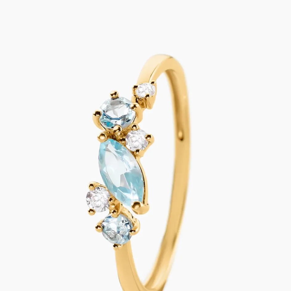 Bague Or Jaune 375/1000 Multipierres Topaze Bleu Sky Navette Et Ronde Accompagnee D’Oxyde De Zirconium