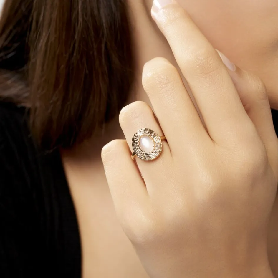 Bague Plaqué Or Jaune Forme Ovale Pierre De Lune Effet Strie