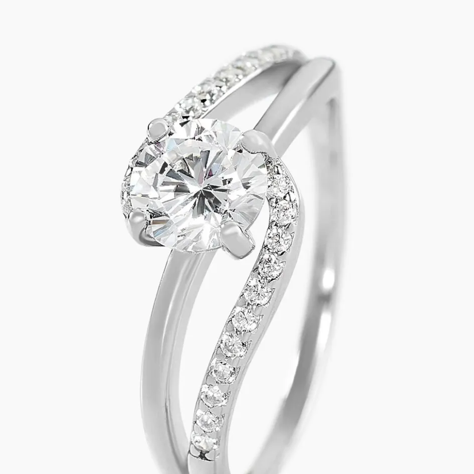 Bague Solitaire Argent Blanc 925/1000 Oxyde De Zirconium Central Double Vague Oxydes De Zirconium