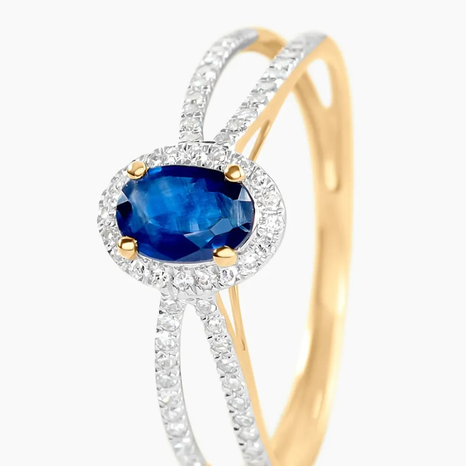 Bague Or Jaune 375/1000 Saphir Ovale 0,45Cts Serti Griffes Entourage Diamants