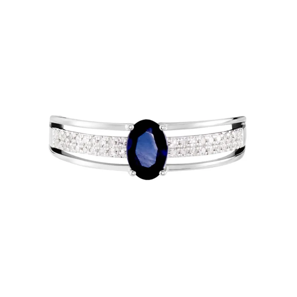 Bague Or Blanc 375/1000 3 Rangs Pavage Diamants Saphir Oval Central 0.48ct