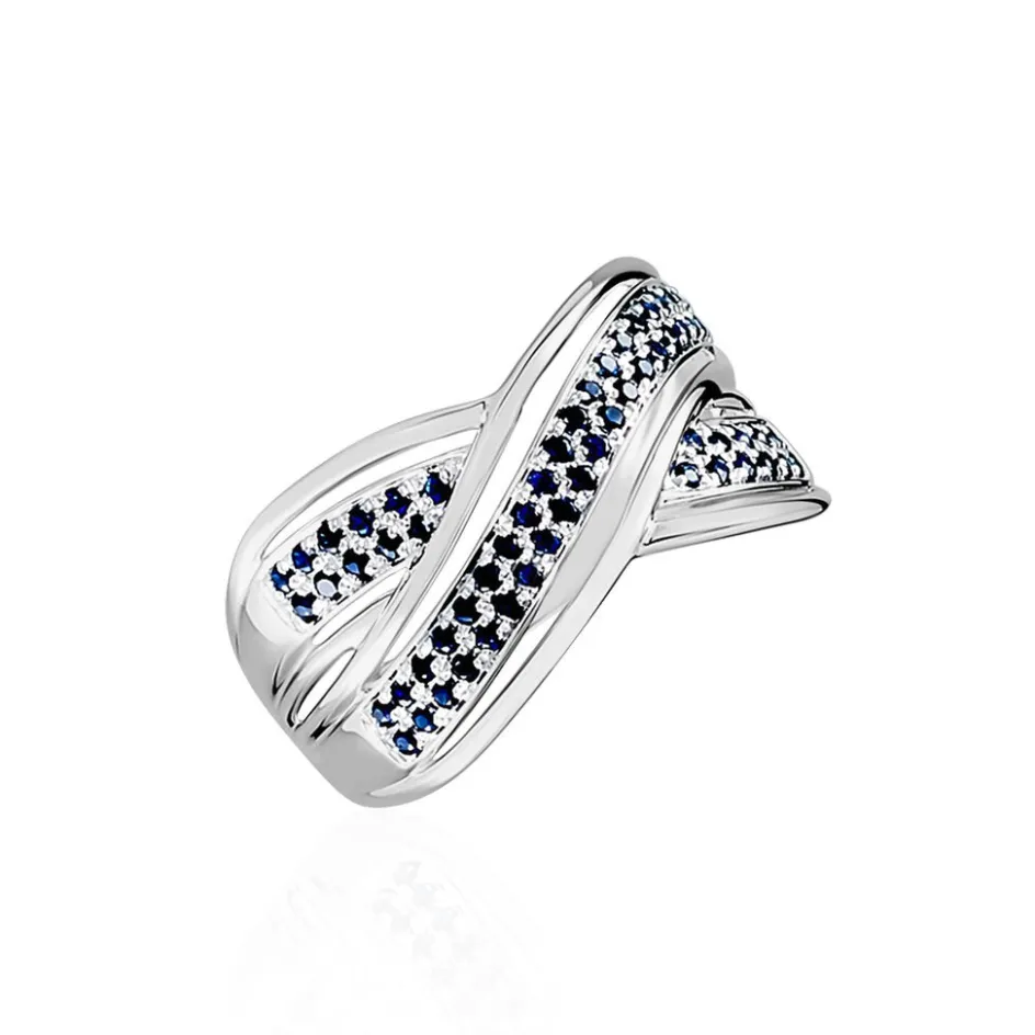Bague Or Blanc 375/1000 Forme Croise Pavage Saphirs Bleu 0.372ts