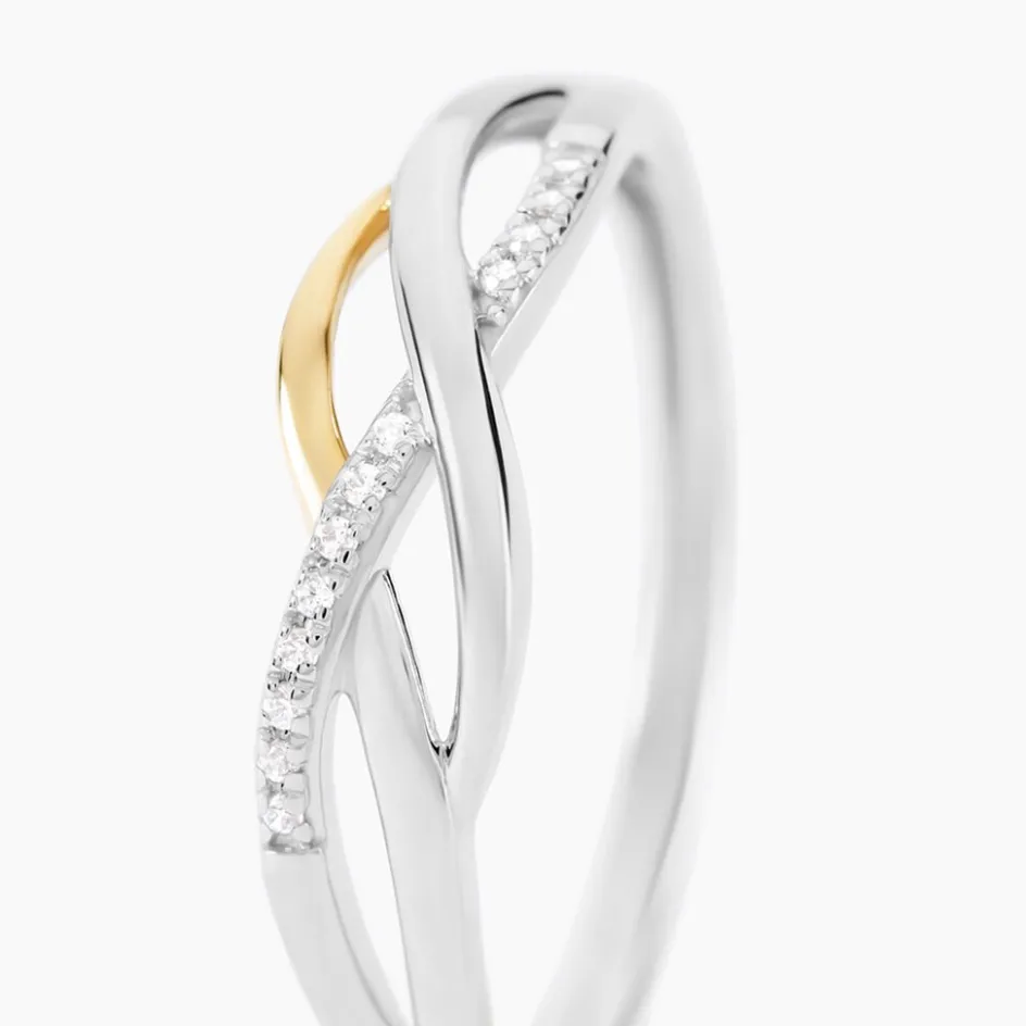 Bague Or Jaune 375/1000 Et Argent Blanc 925/1000 Vagues Entrelacees Oxydes De Zirconium Blancs