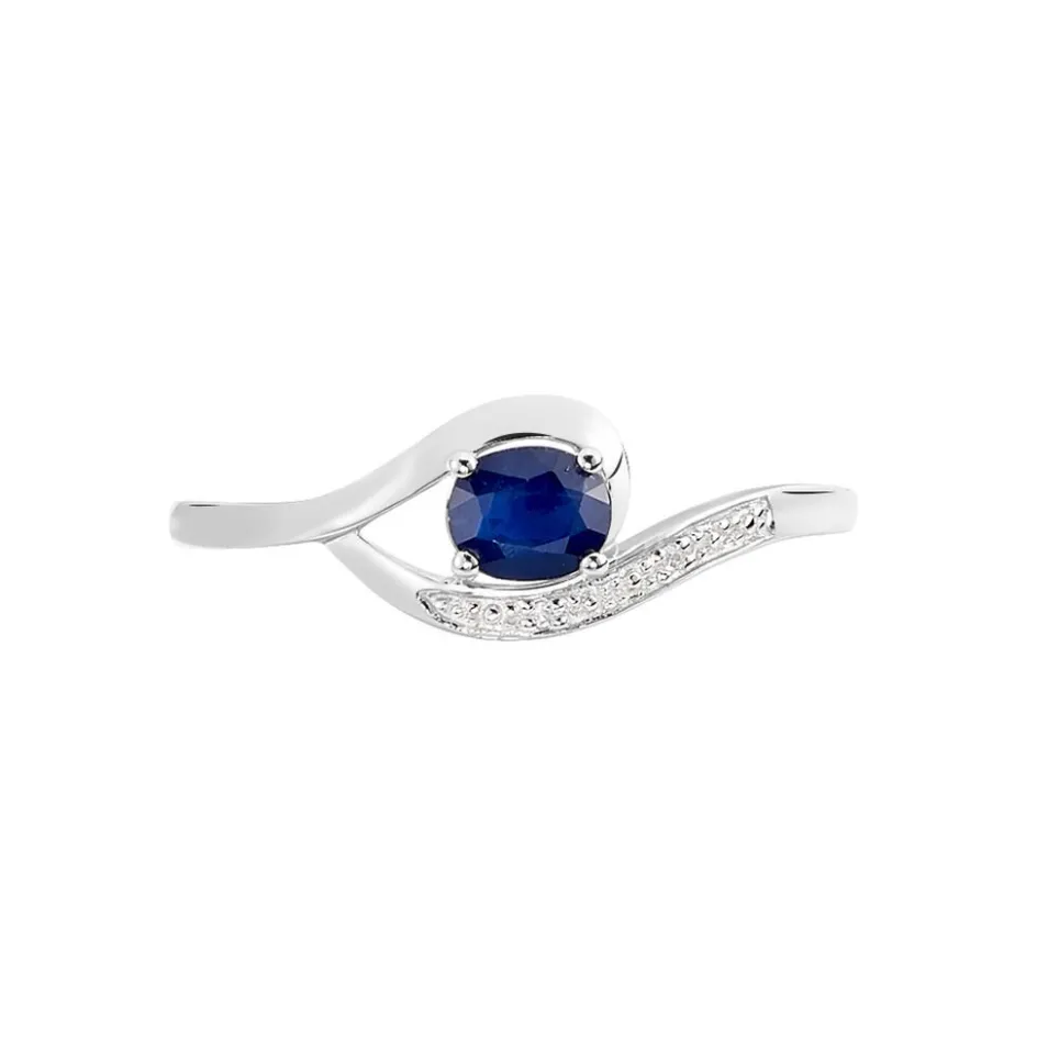 Bague Or Blanc 375/1000 Sagesse Saphir Bleu Central Serti Griffes Accompagne Diamants