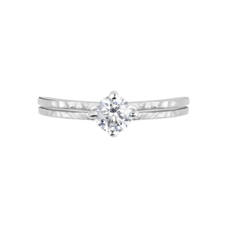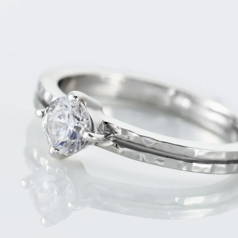 Bague Solitaire Argent Blanc 925/1000 Corps De Bague Martelé Oxyde De Zirconium Serti 4 Griffes 5mm