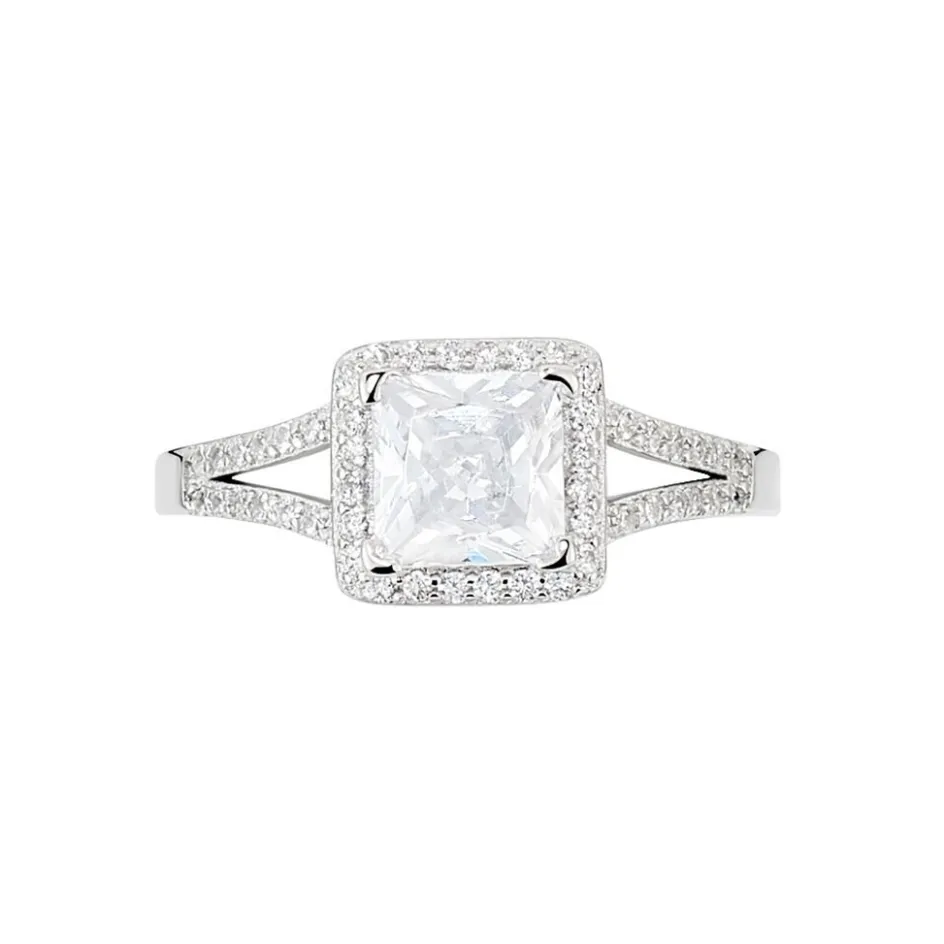 Solitaire Bague Argent Blanc 925/1000 Oxyde De Zirconium Carre Central Accompagne Entourage Oxydes De Zirconium