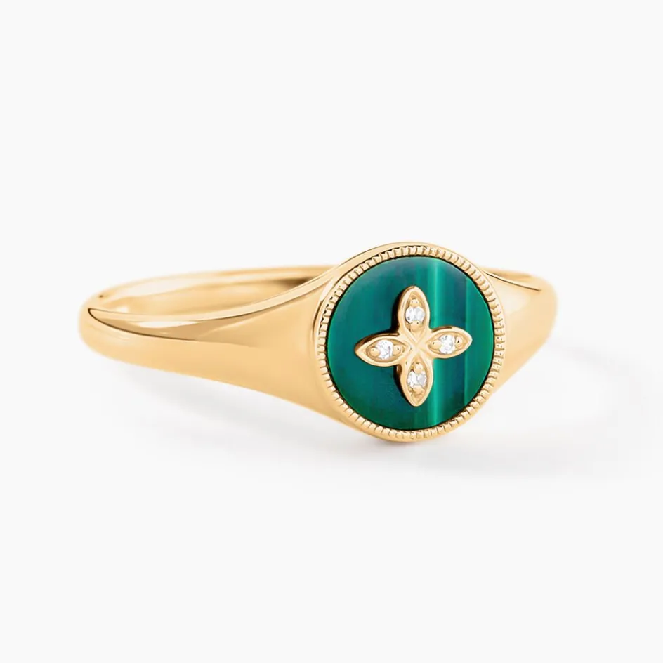 Bague Or Jaune 375/1000 Malachite Verte Et Motif Fleur Diamants
