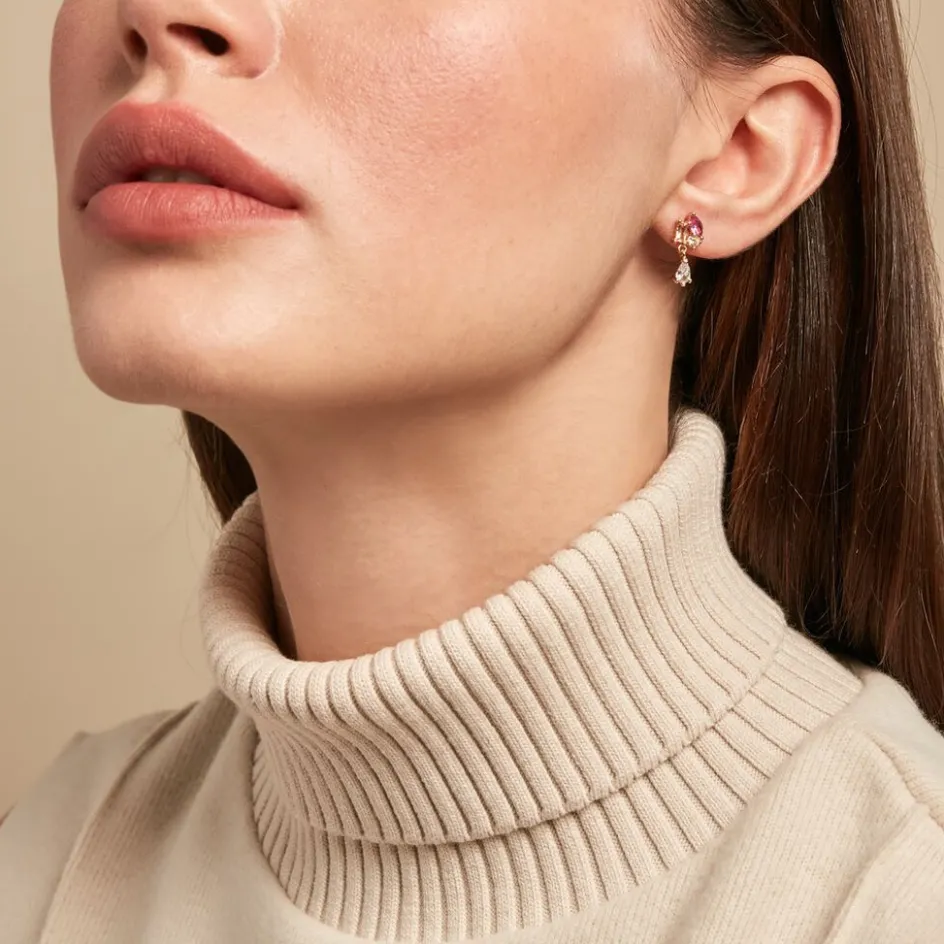 Boucles D’oreilles Pendantes Plaqué Or Jaune Asymetriques Jardins De Pierres Spinelles Fuschia Et Oxydes De Zirconium Multicolores