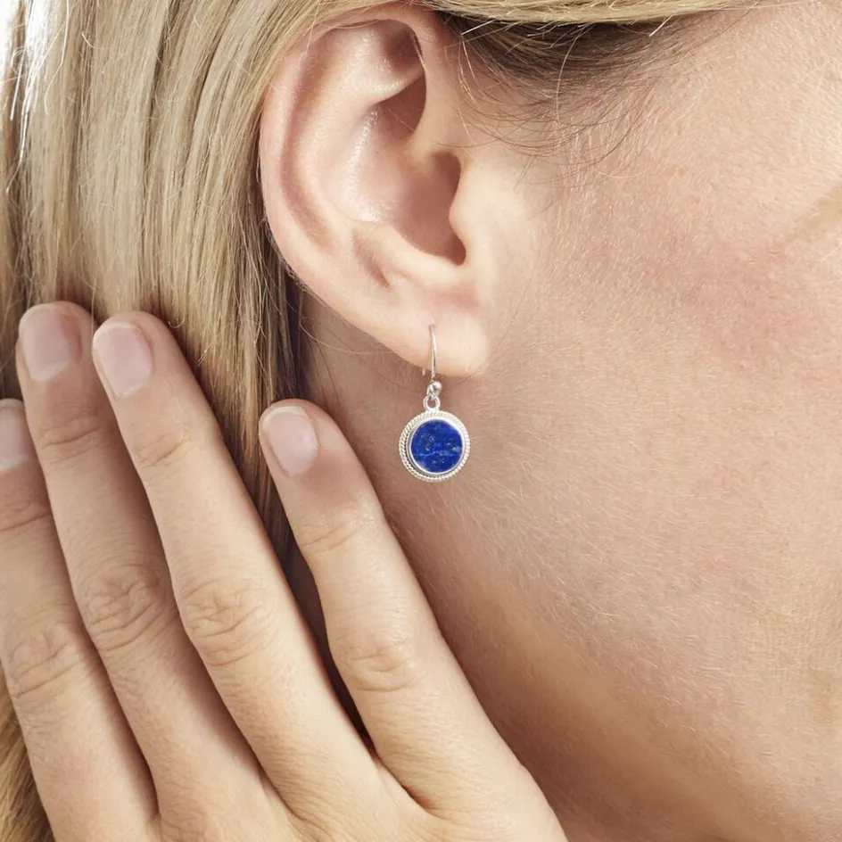 Boucles D’oreilles Pendantes Argent Blanc 925/1000 Pastilles Entourages Torsades Lapis Lazuli
