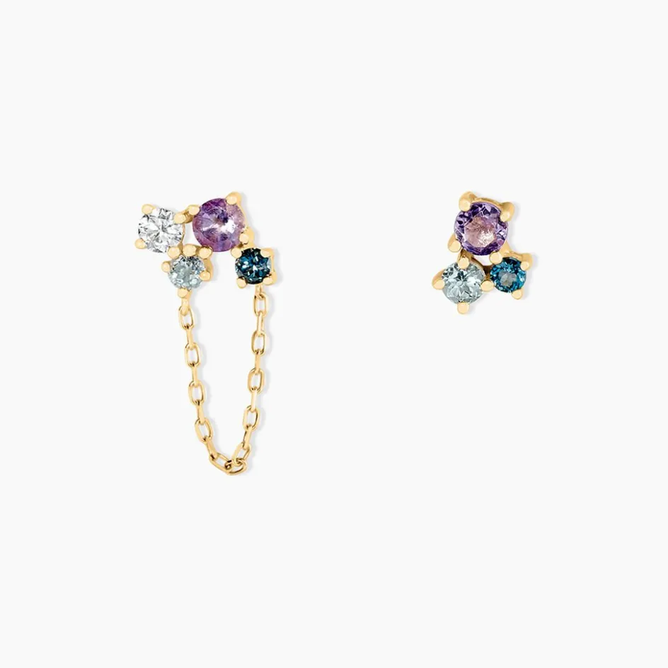 Boucles D’oreilles Depareillees Or Jaune 375/1000 Mutlipierre Amethyste Topaze Et Oxyde De Zirconium Serti Griffes