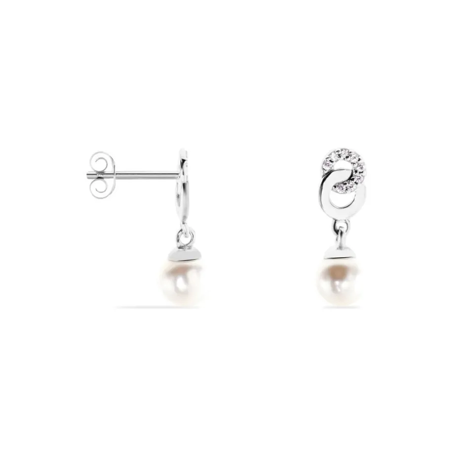 Boucles D’oreilles Argent 925/1000 2 Anneaux Entrelaces Oxydes De Zirconium Et Perle De Culture 5.5mm