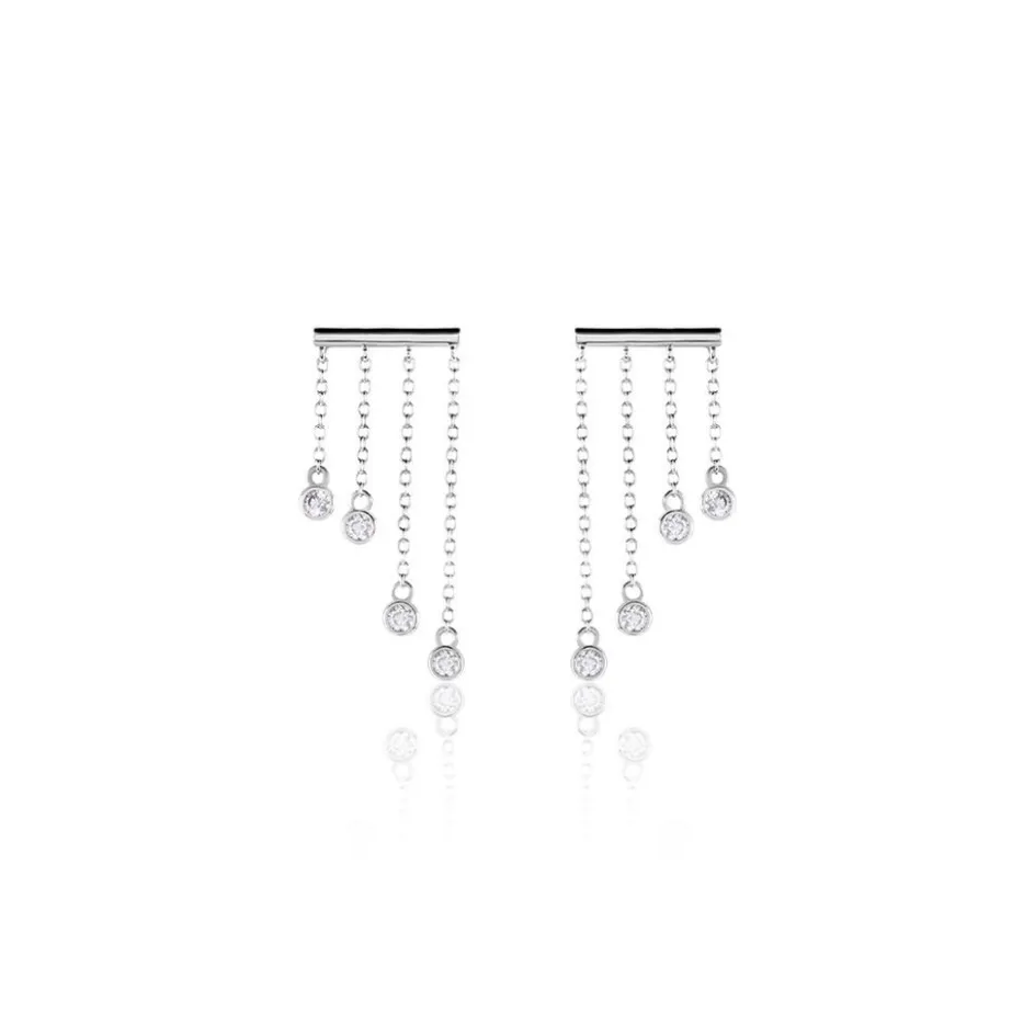 Boucles D’oreilles Pendantes Argent Blanc 925/1000 Barre Multichaines Oxydes De Zirconium Serti Clos