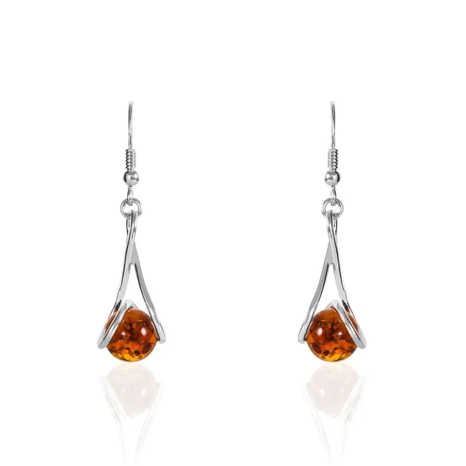 Boucles D’oreilles Pendantes Argent Blanc 925/1000 Ambre Forme Boule Ella