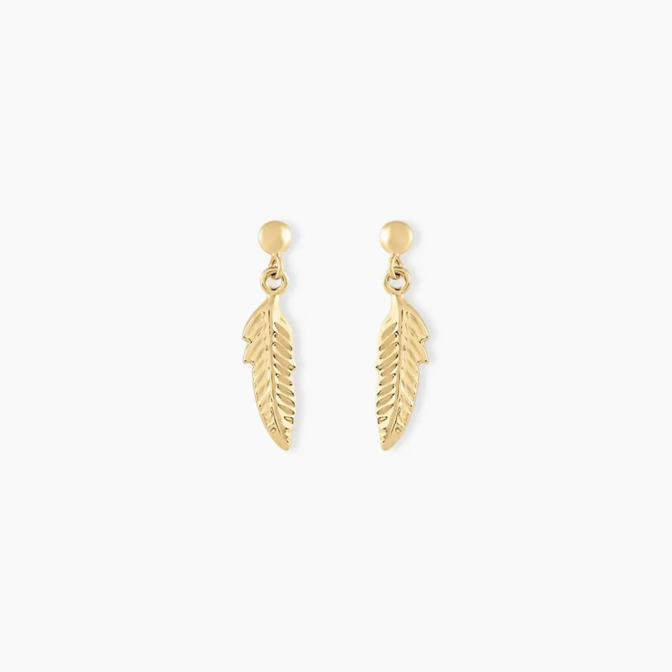 Boucles D’oreilles Or Jaune 375/1000 Pendantes Motifs Plumes