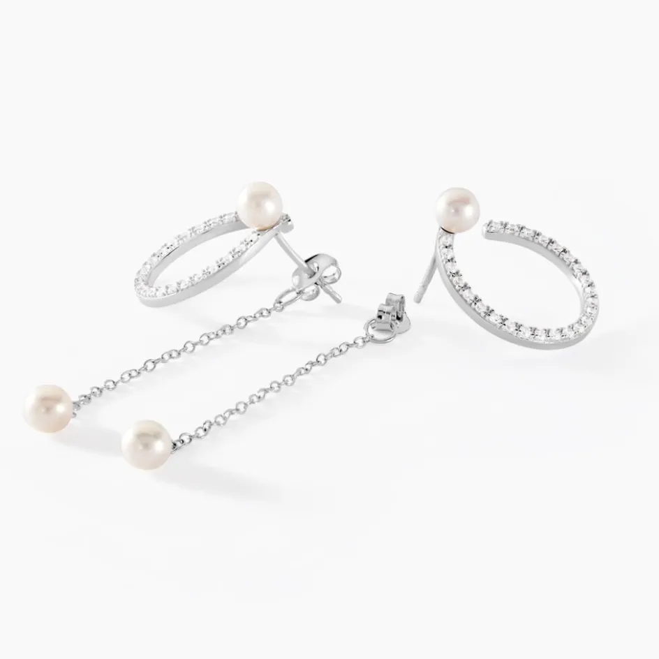 Boucles D’oreilles Pendantes Argent Blanc 925/1000 Perles Blanches Pavage Oxydes De Zirconium Fermoirs Chaînes Forçat Perle Pendante