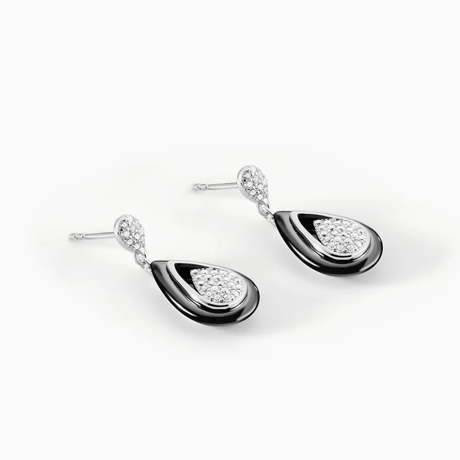 Boucles D’oreilles Argent Blanc 925/1000 Formes Gouttes Ceramique Noire Et Oxydes De Zirconium