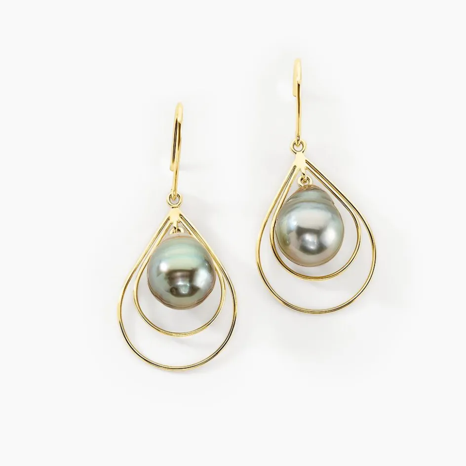 Boucles D’oreilles Or Jaune 375/1000 Perle De Culture Mer Du Sud Tahiti 8/9mm Semi-baroque