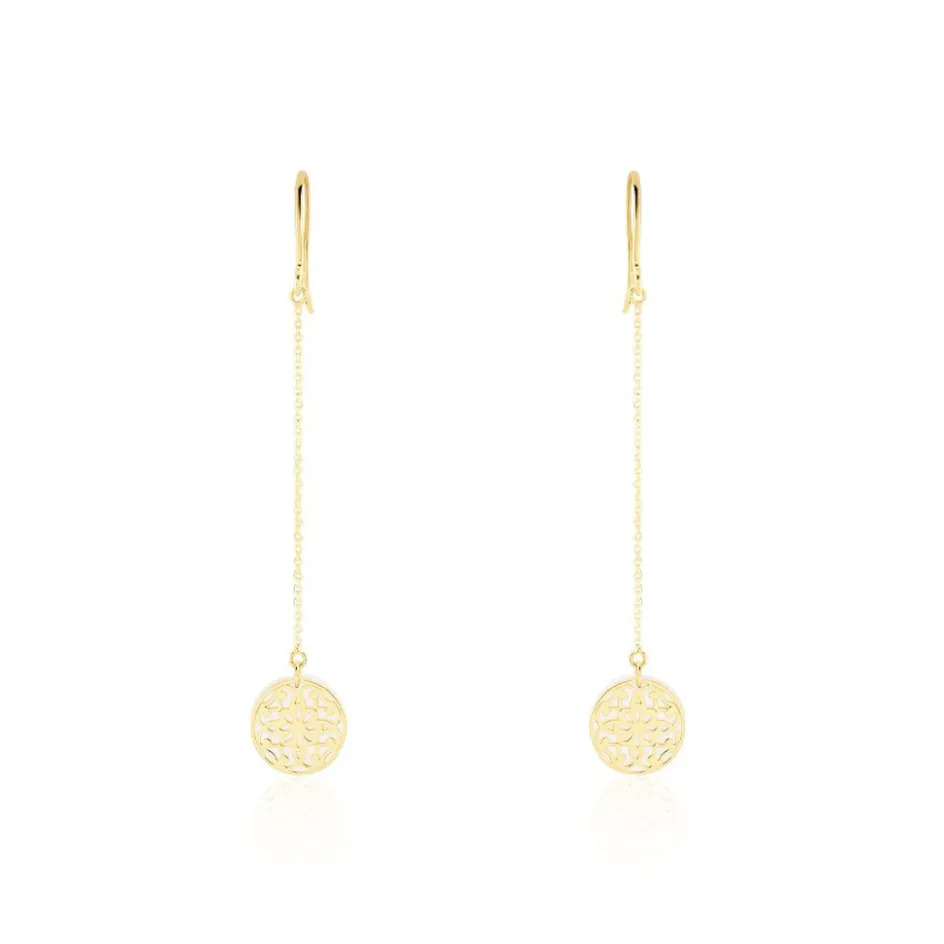 Boucles D’oreilles Pendantes Or Jaune 375/1000 Motif Rosace Et Nacre Maille Jaseron
